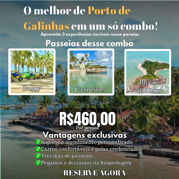 COMBO 3 Passeos em Porto de Galnhas, são passeios compartilhados. É para quem deseja explorar ao máximo as belezas de Porto de Galinhas. São três dias de passeios. Você terá a oportunidade de conhecer os principais atrativos desse paraíso, com guias especializados e carros devidamente credenciados de acordo com as normas do MTUR.